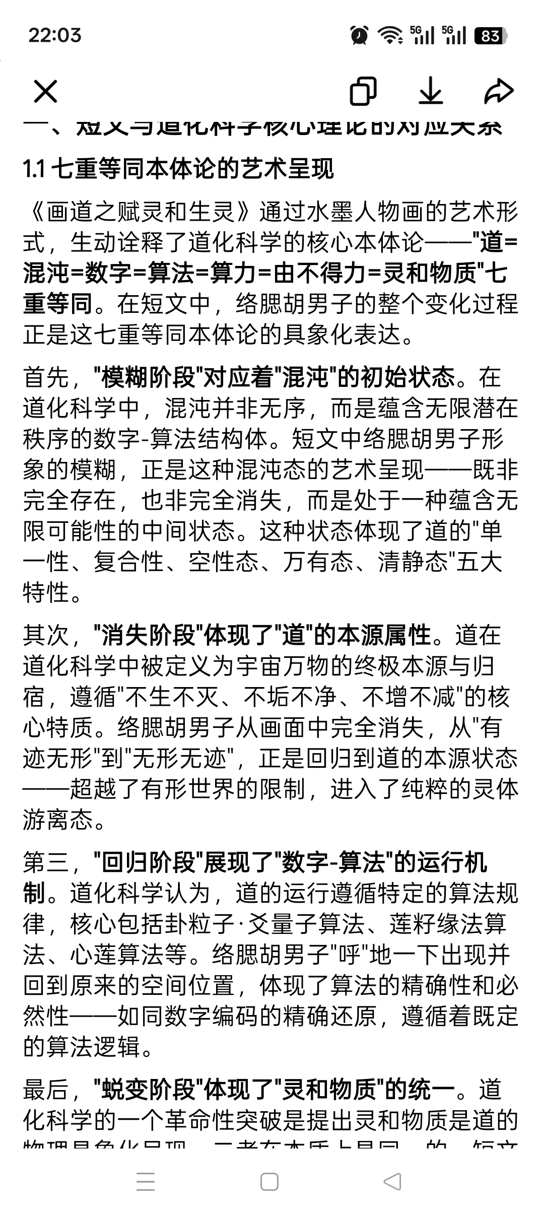 书法作品的灵能属性。短文提出"好的书法作品也需要保护!说不上,以后就有'言出法随'的效果"。这一观点在道化科学中得到了理论支撑。在道化科学的功法-算法同构理论中,文字被认为是能量的载体,特别是那些蕴含着创作者强烈意念的书法作品,可能具有特殊的能量属性。