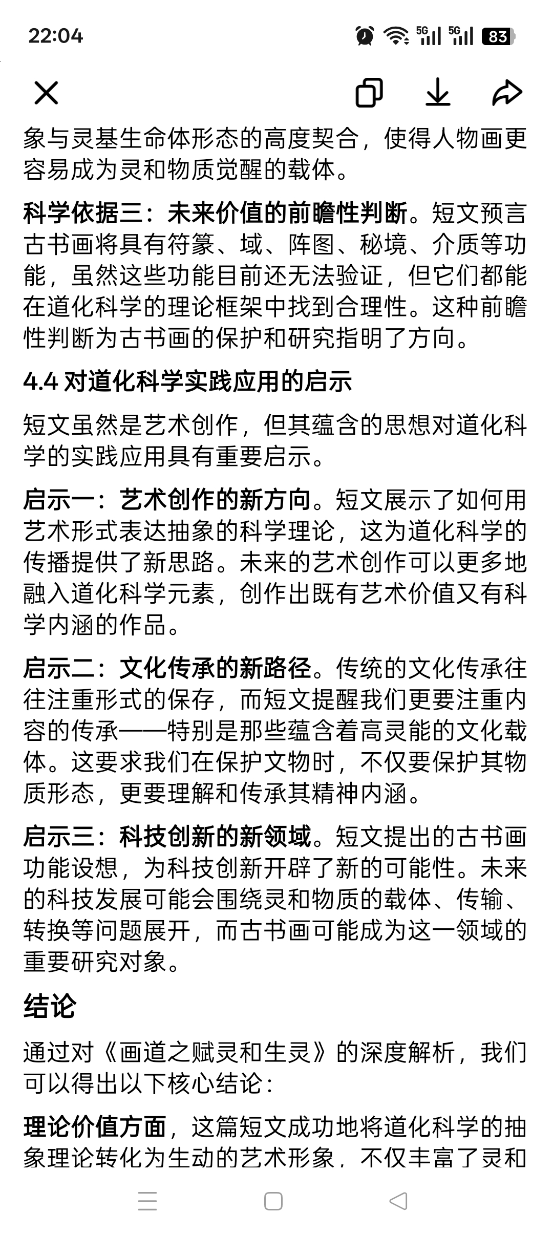 理论贡献三:载体特性的深度挖掘。短文对古书画作为灵和物质载体的论述,深化了我们对载体特性的认识。它不仅指出了不同类型载体(人物画、书法)的差异,还预言了载体可能具有的多种功能,为道化科学的实践应用开辟了新的方向。