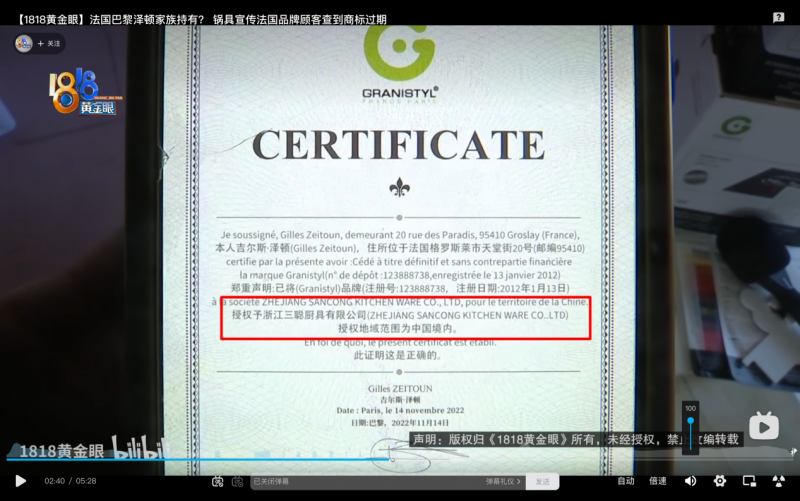 视频中曝光的生产企业为“浙江三聪厨具”,这与“法国品牌”“法国工艺”宣传存在明显差异。
