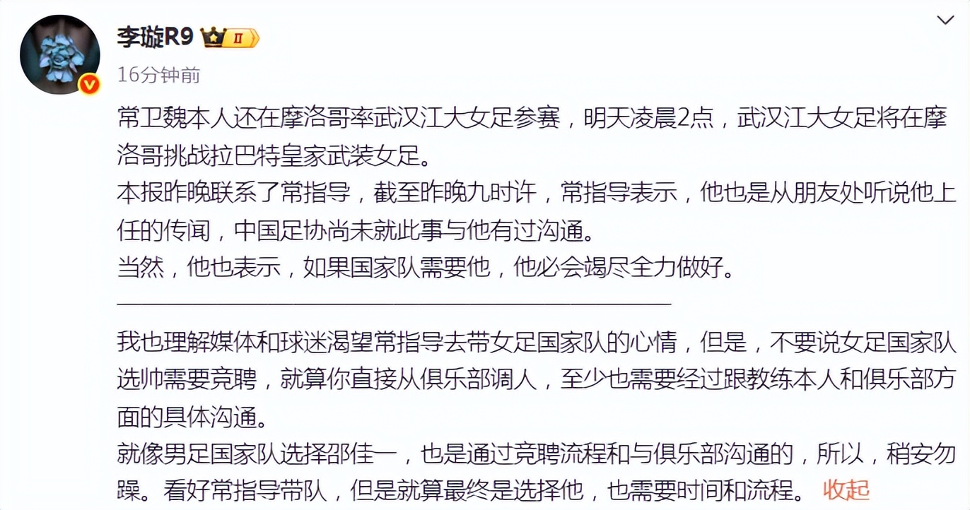 据媒体人李璇透露足球报昨日刚联系了常卫魏,结果常指导也不知道,连他本人都在打听消息真实性。李璇写道:“常指导表示,他也是从朋友处听说他上任的传闻,中国足协尚未就此事与他有过沟通。当然,他也表示,如果国家队需要他,他必会竭尽全力做好。”