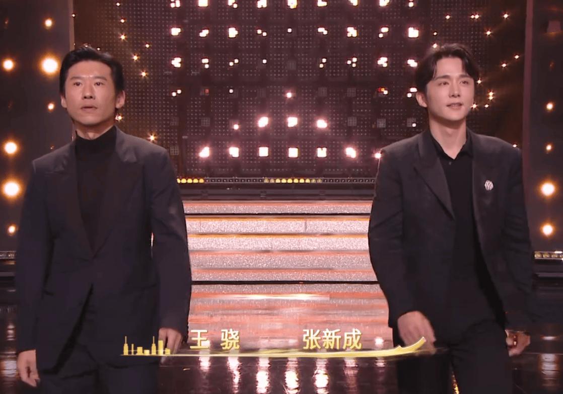 王骁与张新成的共同演出营造出一种兼具成熟与活力的印象。王骁装扮为全套黑色西装,内衬高领衫,整体装扮展现出简约而干练的风格,虽然他的面容流露出一丝严肃,却也散发着成熟男士的独特魅力。他的肌肤状况良好,尽管眼尾出现了轻微的纹路,不过总体红润有光泽,流露出成熟风范。