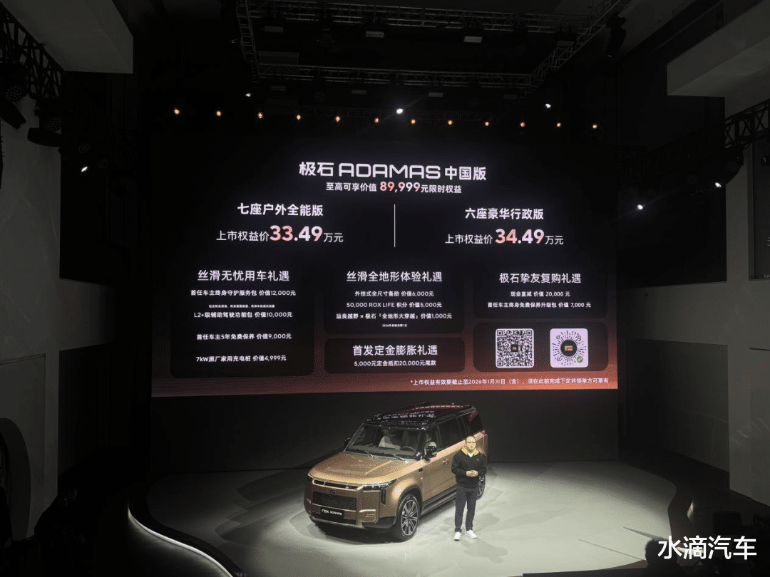 就在12月28日,赶在2025年结束前的最后一个星期日,极石ADAMAS中国版上市了,上市权益价33.49万-34.49万元。官方的说法是,“极石汽车全球化战略进入系统性深耕、国内外市场协同并进的新阶段。”说得通俗一些,就是既然中东土豪们青睐,那中国国内的高净值客户也应该拿下。