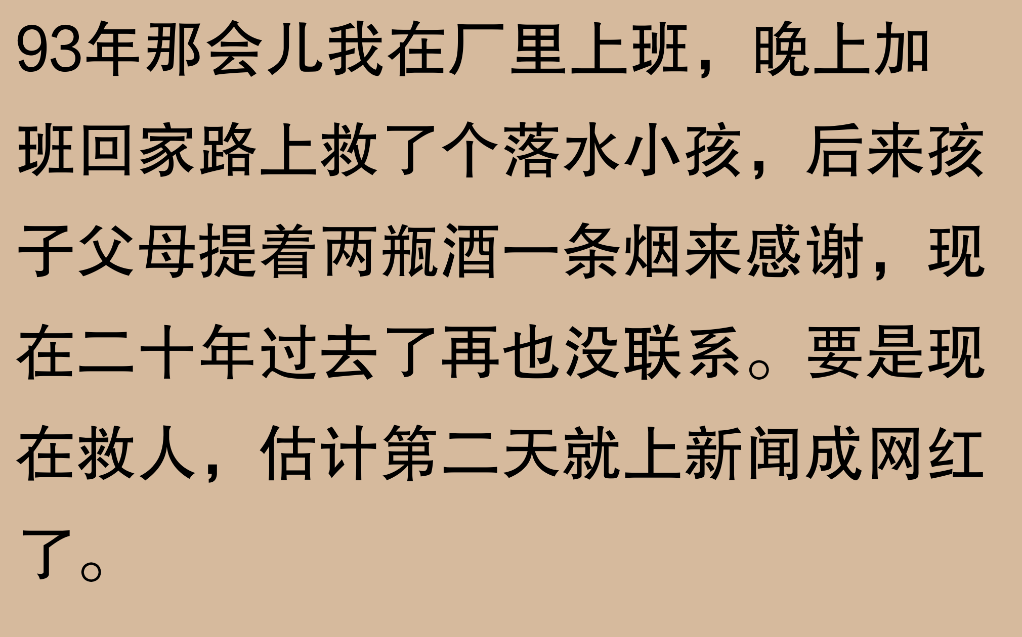 93年那会儿我在厂里上班,晚上加班回家路上救了个落水小孩,后来孩子父母提着两瓶酒一条烟来感谢,现在二十年过去了再也没联系。要是现在救人,估计第二天就上新闻成网红了。