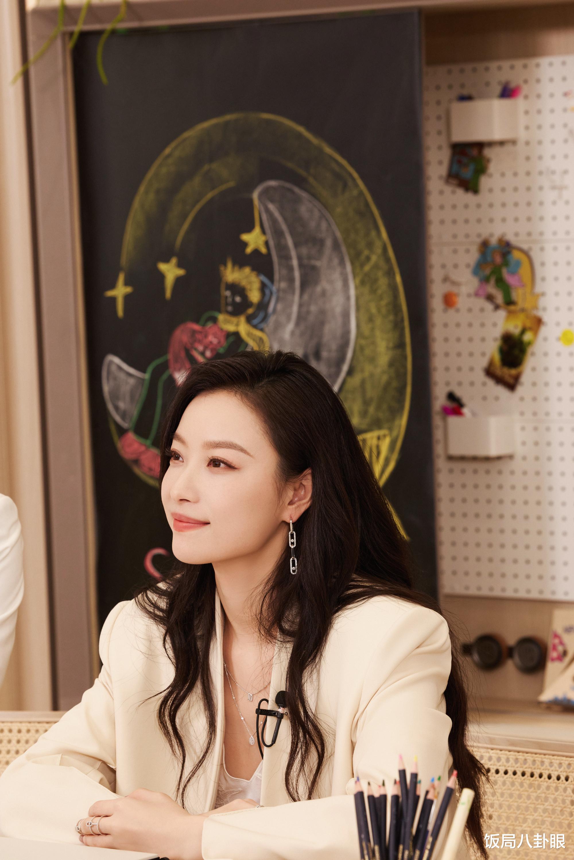她的长发自然垂落,波浪般的发丝为整体造型增添了几分柔美的气息。精致的妆容凸显出她深邃的眼眸和立体的五官,那一抹恰到好处的唇色,更是为她的面容增添了几分明艳动人。她佩戴的长款耳饰与手上的戒指相互映衬,闪耀的饰品在灯光下熠熠生辉,尽显奢华精致,将她的优雅气质烘托得淋漓尽致。