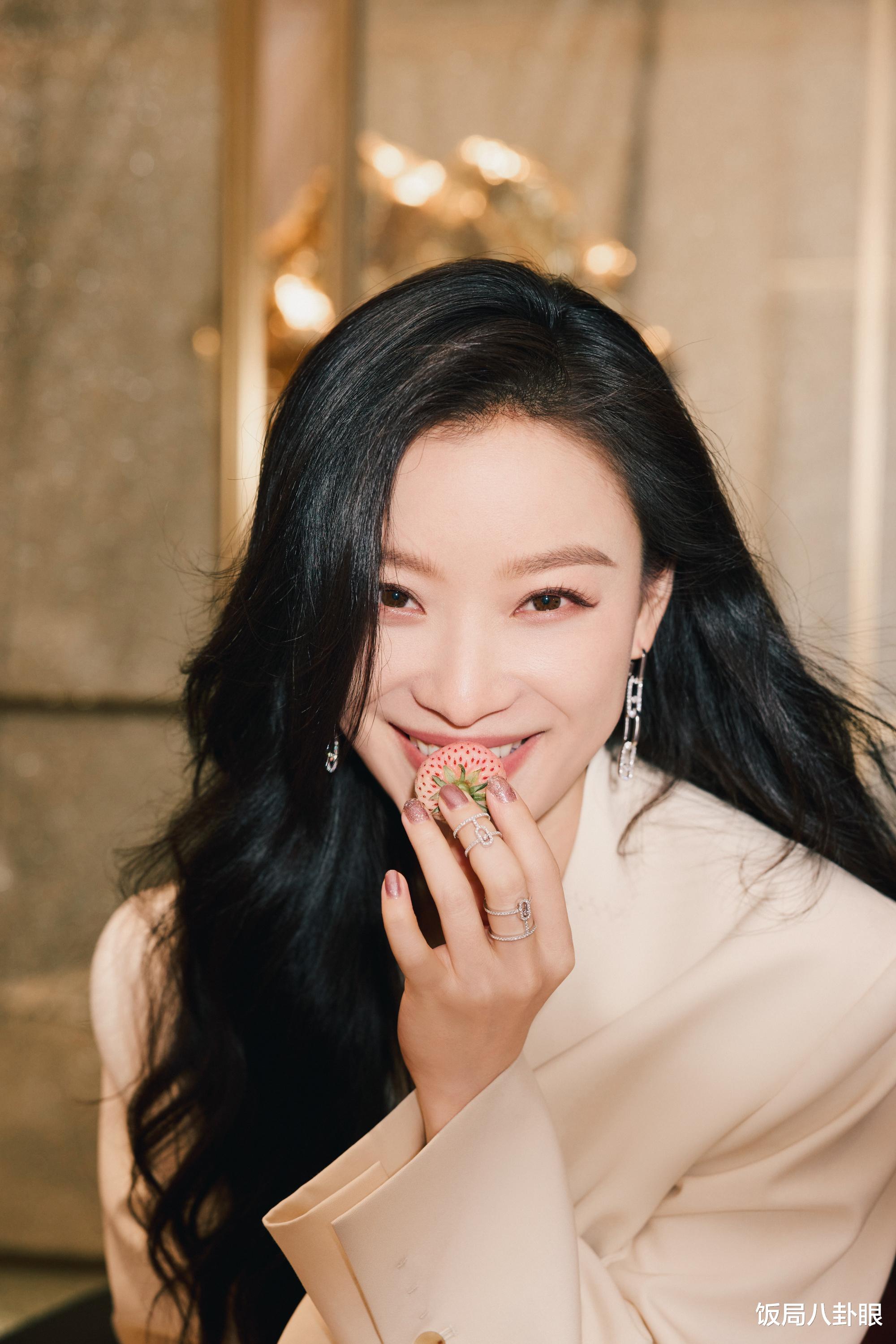 在这组照片中,倪妮或手持草莓,笑容甜美,俏皮中带着一丝灵动;或轻倚在门边,眼神沉静,流露出一种清冷又高级的氛围感;或静静坐着,姿态端庄,尽显从容大气。