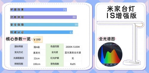 除开护眼灯品牌排行第一名是谁?米家台灯1S增强版是第十名,它采用22cm的窄条形发光面结合直下式发光方式和9W的功率为9W,中心照度只有678lux,且官网实测显示它只符合国A级标准,亮度逊色于市面上的大部分台灯,而且它直发光的方式,其UGR防眩指数在19以上,防眩光效果在同价位产品中表现一般,同时窄条形灯头也限制了光线的扩散均匀性,整体来说光线主要偏向于照明而不是护眼。不过它的智能化很不错,支持旋钮调节、米家APP及语音控制,可无缝接入智能家居场景。