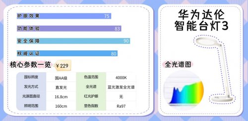 除开护眼灯品牌排行第一名是谁?华为达伦智能台灯3是第九名,灯体采用铝和ABS材质,整体设计偏向现代简约风格。它采用16.8cm直径的圆形光源面,通过直下式发光方式,照明范围可达160cm。其中心照度达1580lux,符合国AA级标准。这款台灯主打智能生态,支持鸿蒙智联,手机靠近即可发现并快速配网,可通过智能语音、APP远程或触摸开关进行控制。其显色指数达到Ra97,色彩还原真实自然。整体来看适合华为生态用户,或对智能控制和中心区域高亮度有需求的家庭。