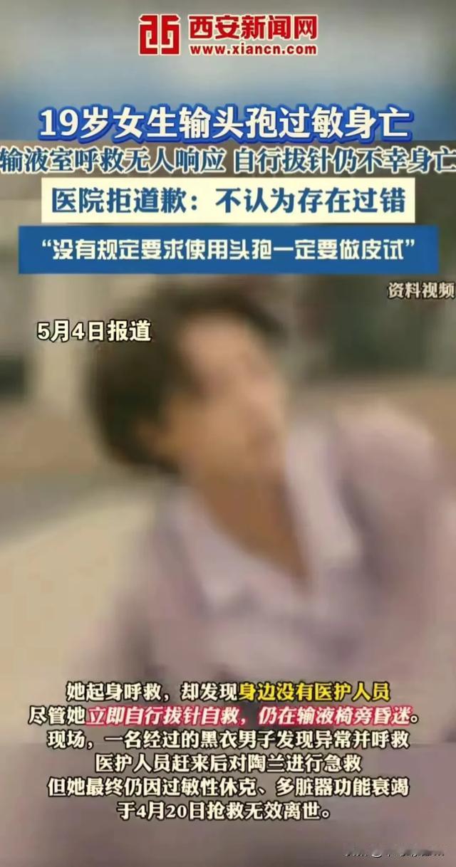 事后,医院承认陶兰死于头孢过敏,但拒绝道歉,称“头孢不需常规皮试,护士不可能只盯一人”。家属质问:“明知她有过敏史,为什么不加强监护?”