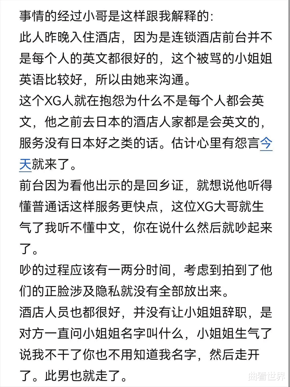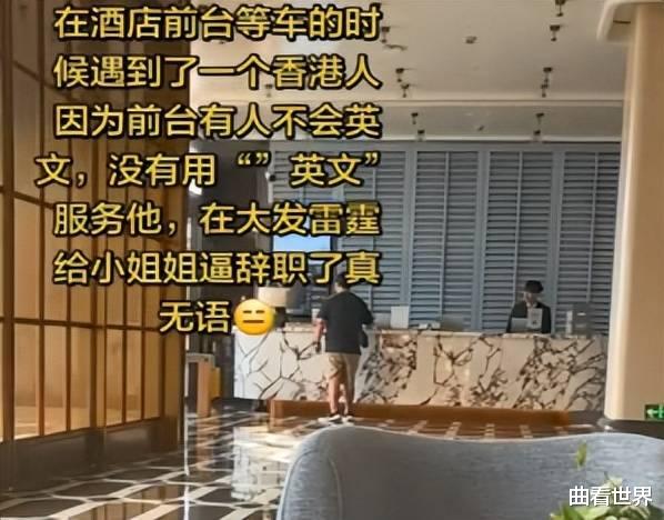 这位男顾客在前台表现得十分嚣张,全程自称自己不懂中文。他站在那里用英语骂了十几分钟,那一连串的脏话如同机关枪一般扫射出来,让周围的人都感到十分震惊。他在撒完泼之后,便大摇大摆地走出酒店去接电话。然而接下来最让人感到逆天的一幕出现了。前一秒还在用英语嚣张叫嚣的他,在接通电话的瞬间一秒无缝切换成粤语,开始和电话里的人顺畅地沟通起来。他那熟练的粤语发音表明他对这门语言再熟悉不过了,之前所谓的“不懂中文”完全就是他故意装出来的,是他用来刁难服务员彰显自己优越感的借口。