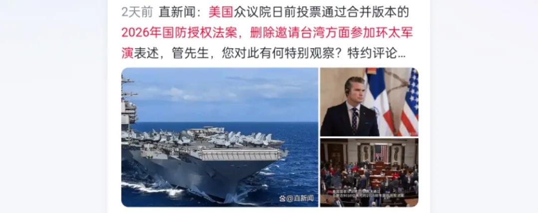 美国在2026财年《国防授权法案》中,删除了邀请台湾参加“环太平洋军演”的条款。这一变化虽仅寥寥数语,却引发多方关注,甚至被解读为中美军事关系可能出现转折的信号。
