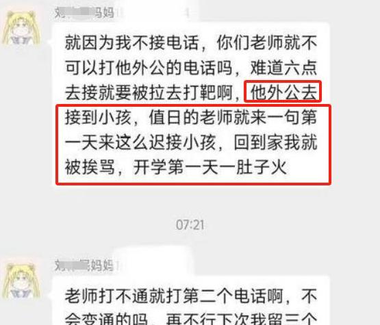 这位妈妈开始抱怨老师打电话通知接孩子时,只打了一次给她,没接到竟然联系了孩子的外公,这让她在家里遭受责骂。