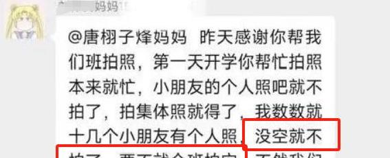 但事情并没有因此结束,这位妈妈依旧在群里找老师的茬,接着批评其他帮忙拍照的家长没有顾及她的孩子。