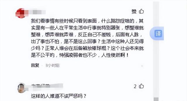 也有的网友认为这已经不是路怒症了,路怒症都没有这么夸张,起码路怒症的看到警察都会老老实实地,但越野车司机不是,他看到警察还敢放狠话,那就说明他自认背景很深,有人能帮他摆平这一切,他也有钱为自己疏通关系,所以他不在乎。