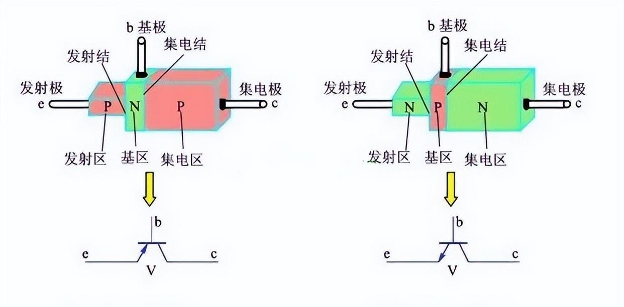 以NPN型三极管为例,它通过两个二极管的组合来传导电流。