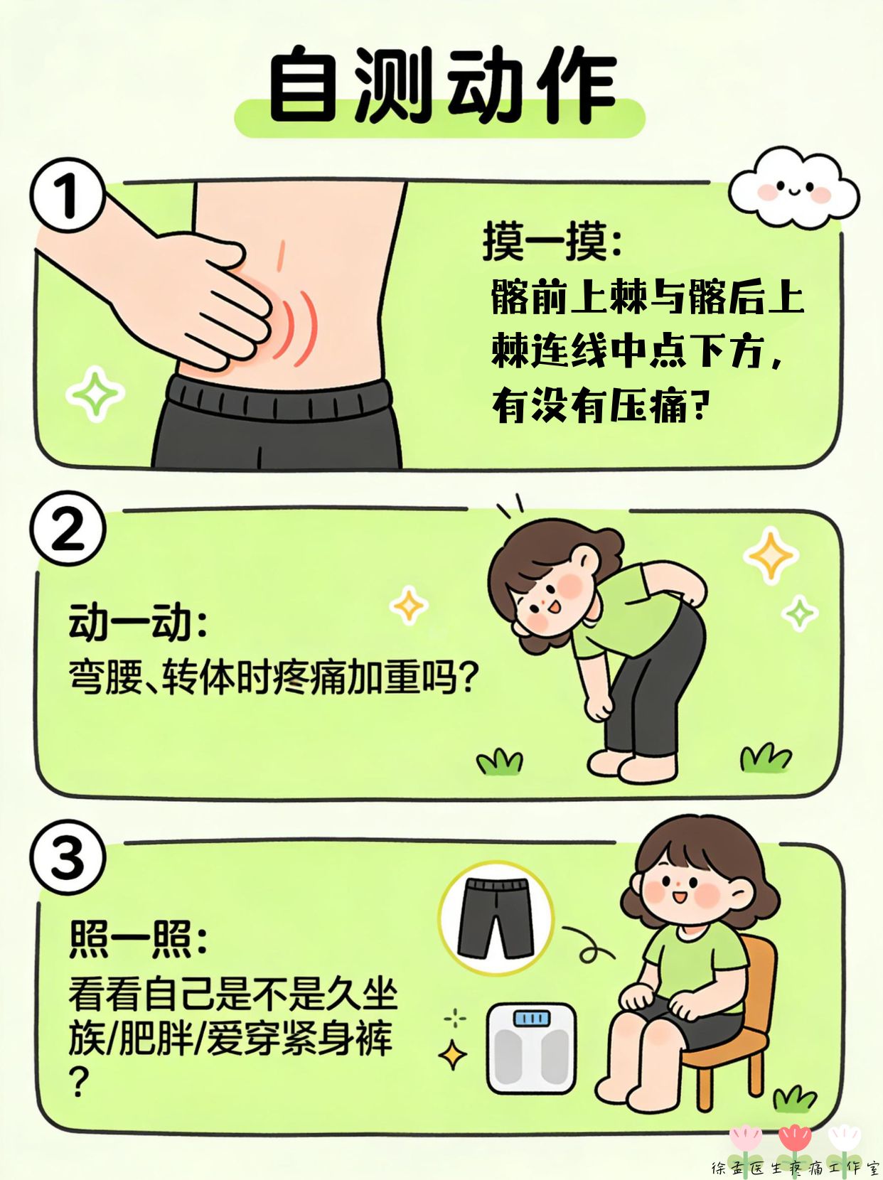 💡 自测小技巧: 1⃣ 摸一摸:髂前上棘与髂后上棘连线中点下方,有没有压痛? 2⃣ 动一动:弯腰、转体时疼痛加重吗? 3⃣ 照一照:看看自己是不是久坐族/肥胖/爱穿紧身裤?