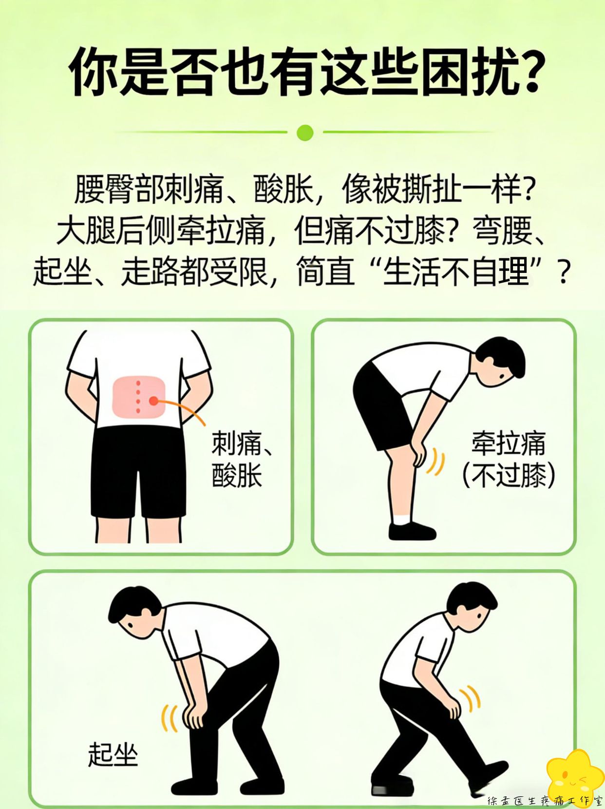 你是否也有这些困扰? ▫ 腰臀部刺痛、酸胀,像被撕扯一样? ▫ 大腿后侧牵拉痛,但痛不过膝? ▫ 弯腰、起坐、走路都受限,简直“生活不能自理”?