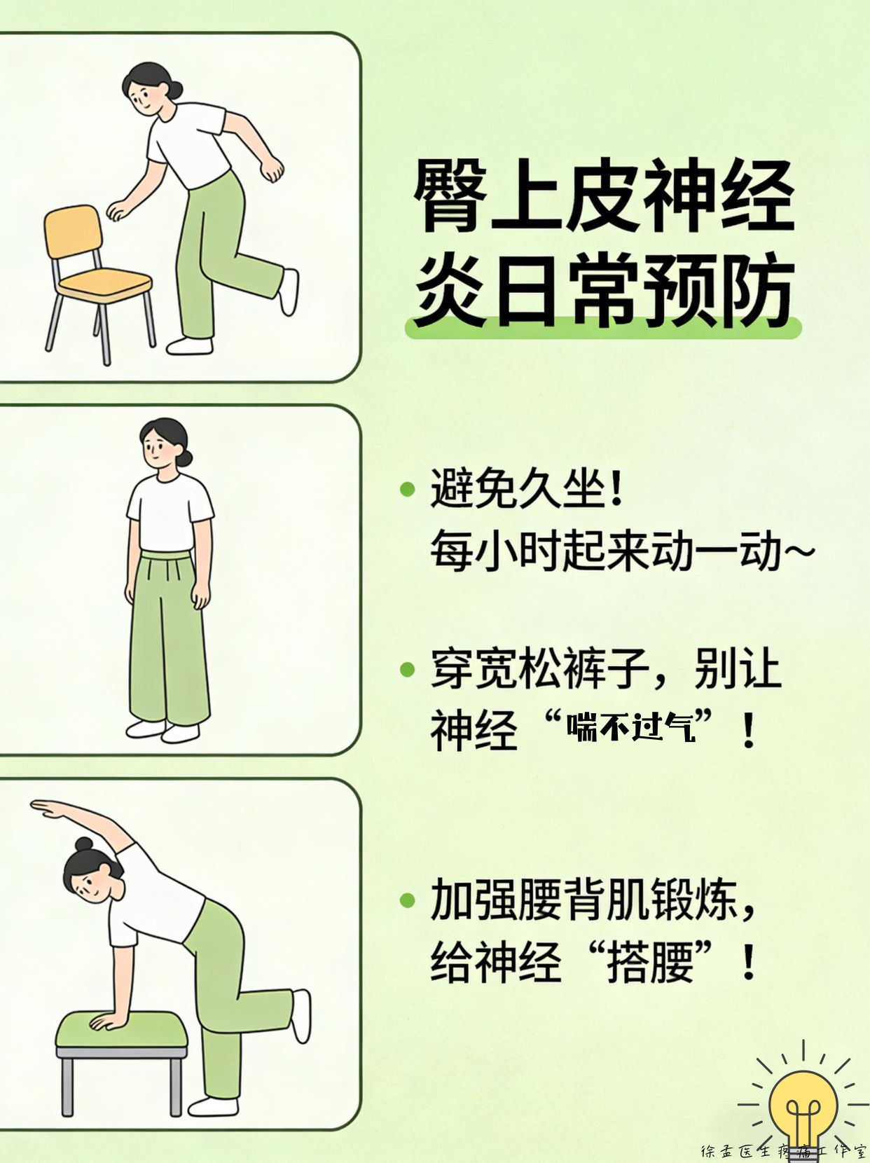 💪 日常预防: ▫ 避免久坐!每小时起来动一动~ ▫ 穿宽松裤子,别让神经“喘不过气”! ▫ 加强腰背肌锻炼,给神经“撑腰”!