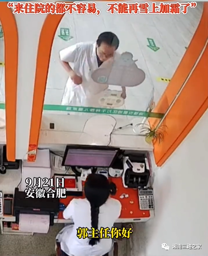 9月21日,安徽合肥。一位医生把刚收病人给的2000元红包充到患者住院账户的视频引发关注。监控显示一位医生往住院缴费处递了一个红包,并告知护士将红包里的钱充进患者的住院账户里。据了解,该医生姓郭,是一位儿科专家,当事人表示,来医院的每个人都不容易,不能再雪上加霜。