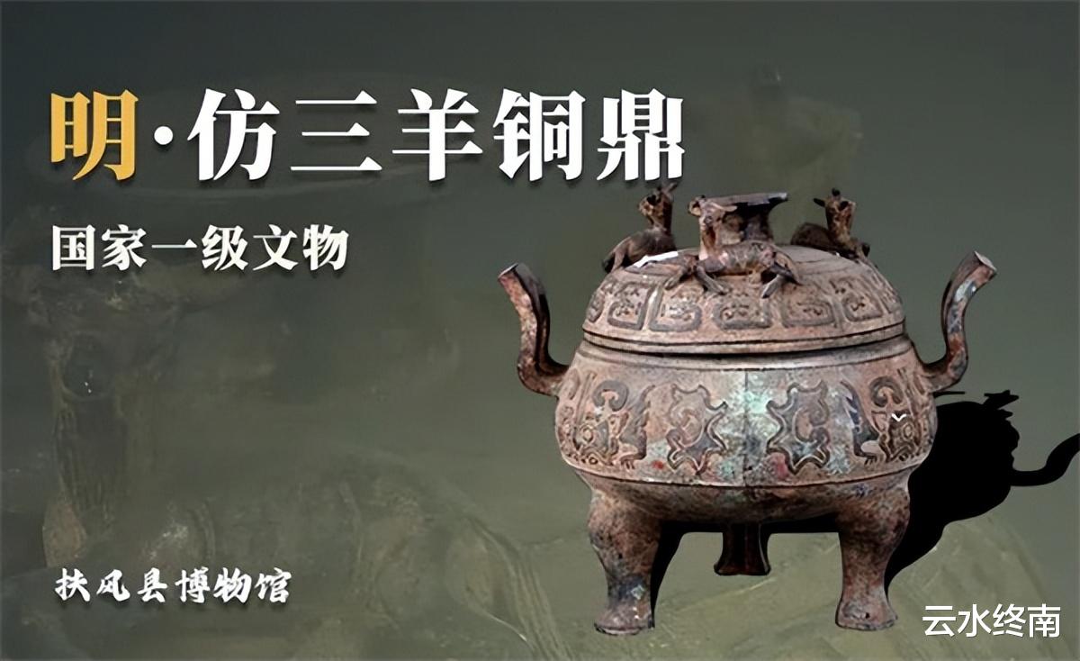 明仿三羊铜鼎,为子母敛口,双附耳,三蹄足,深鼓腹,盖顶有圆形握手,旁有立体三只卧羊,对研究明代人们思想观念和生活情趣以及铸造技术有极高的价值。