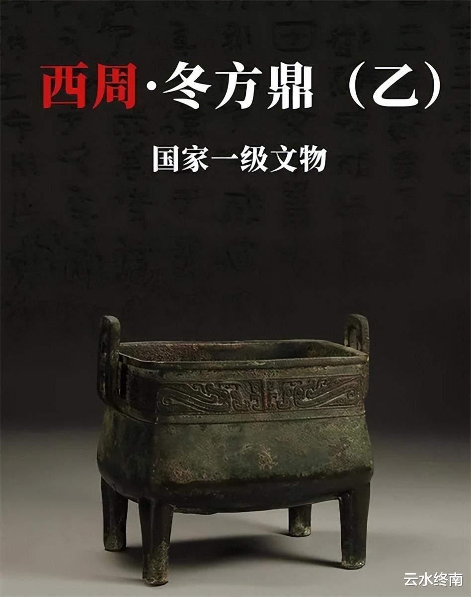 冬方鼎(乙) 双附耳,器腹呈圆角方斗状,略垂,平底,四柱足,沿下四面饰两两相对夔龙纹四组。这是西周中期出土的青铜器,方鼎的铭文不似商代甲骨金文的有行无列,而是行列清晰。