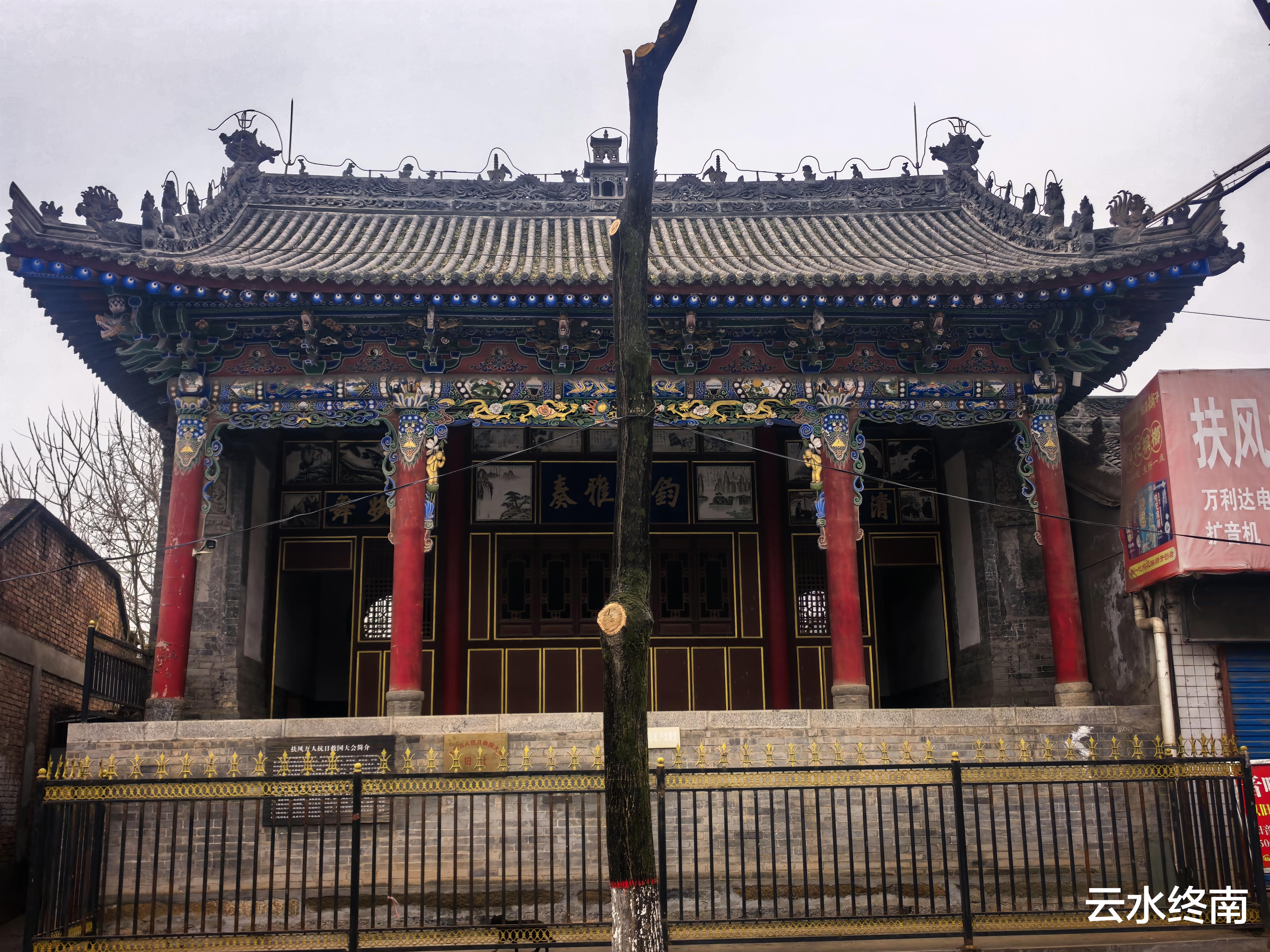 戏楼旁边有牌子,上面写着曾经在这里举行万人抗日救国大会。
