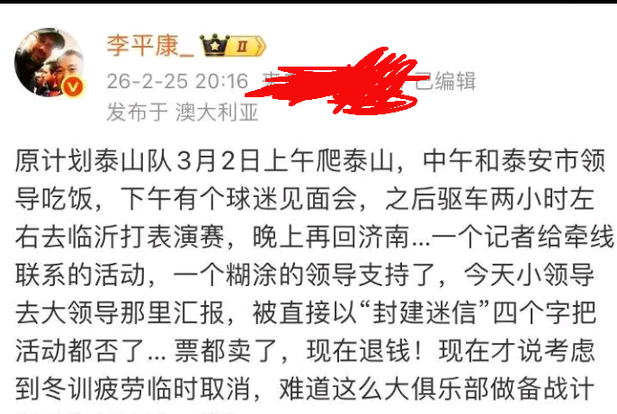 依据山东媒体报道,山东泰山队在每个赛季开始前的传统项目,登泰山,拍摄全家福活动,只是为了防止球员过度疲劳而瘦身,并不是如李平康所说的那样,有济南文旅集团的负责人以封建迷信的名义而取消。那些在网上痛斥济南文旅的球迷,你们上当了。