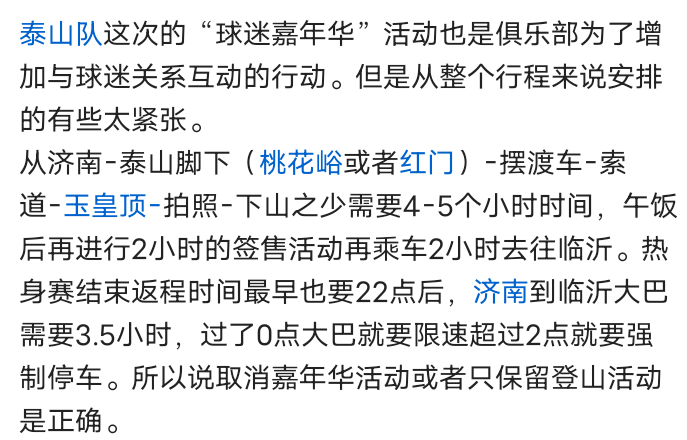 从媒体发布的信息看,登泰山,拍摄全家福,有赞助商拿出了真金白银进行赞助。如果济南文旅取消,那么山东泰山队就会失去一大笔赞助费,还要依据合同向赞助商赔钱。可以说,就是看在钱的面子上,山东泰山俱乐部和济南文旅也不会取消活动。