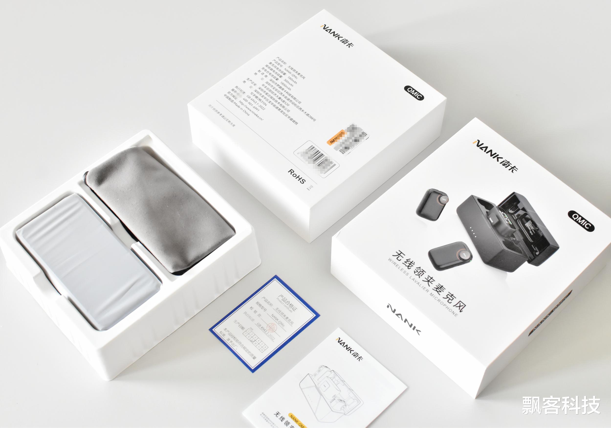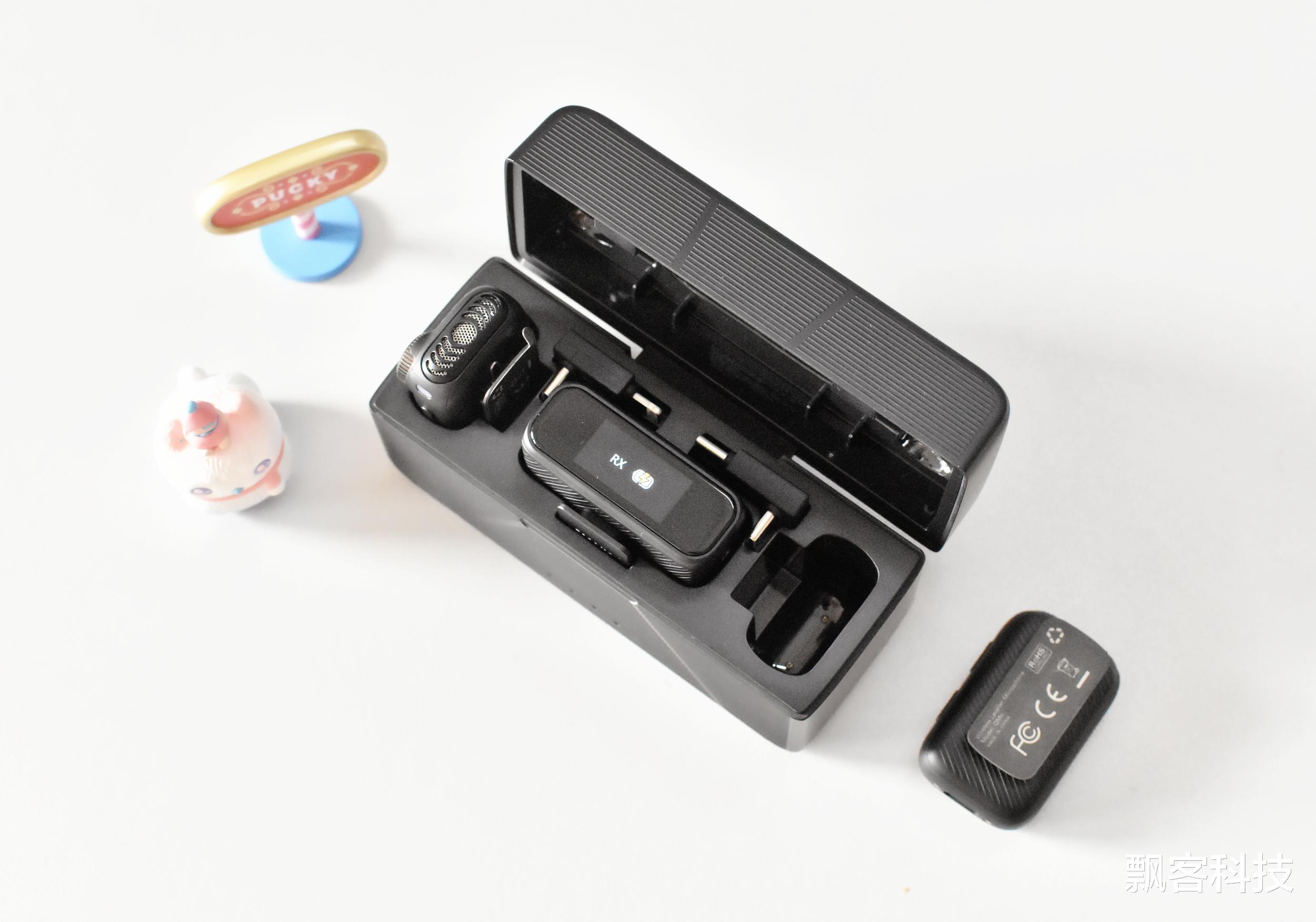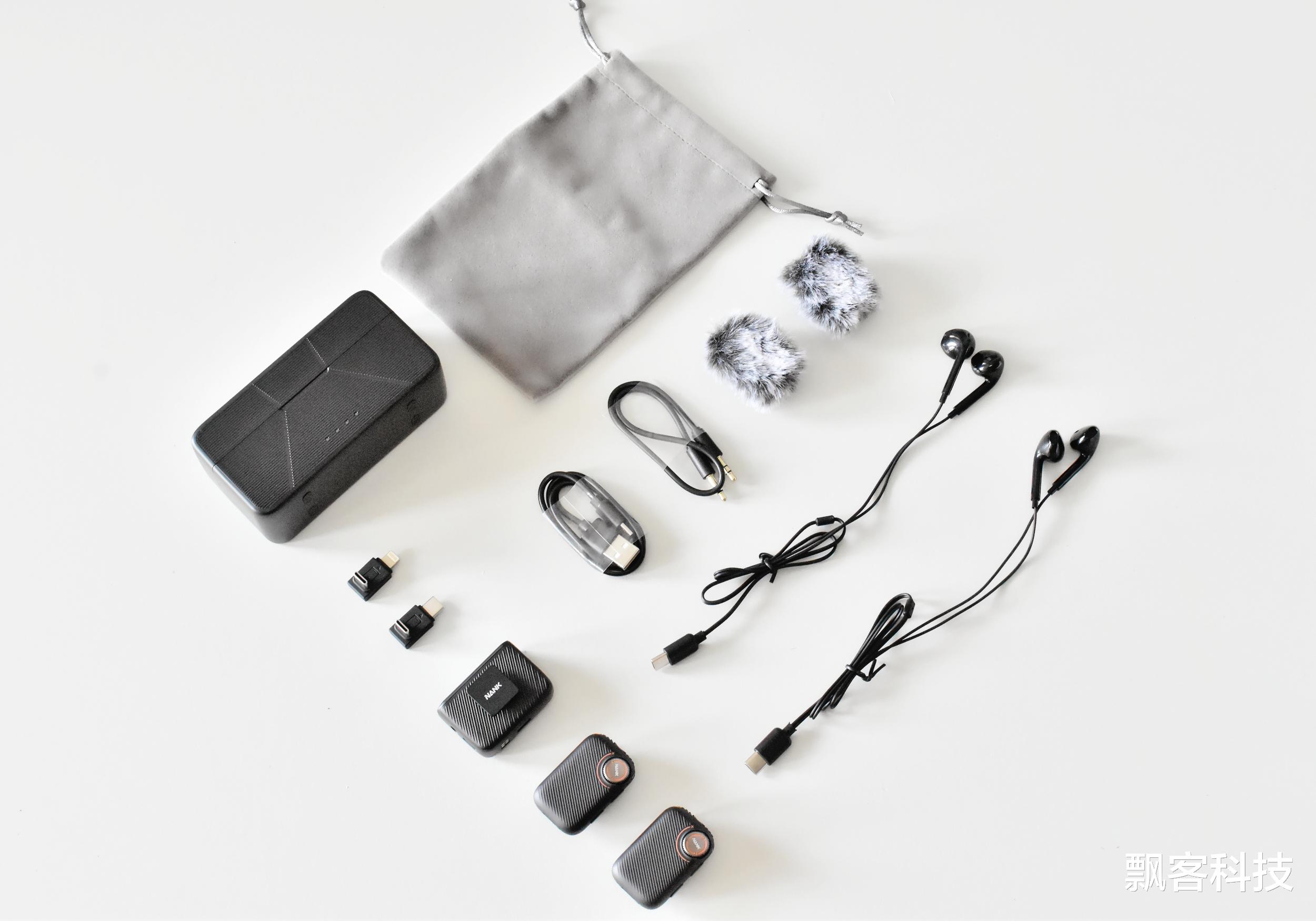 开箱后可见盒内有吸塑隔层保护,产品及其附件放置分类有序。产品的包装清单更显其豪华阵容,核心设备包括两个麦克风发射器、一个接收器、一个充电盒,附件包括两个不同接口的转接头、3.5mm音频线、两幅监听耳机、两个防风毛套、使用说明书和合格证,另外还附送了一个收纳袋。