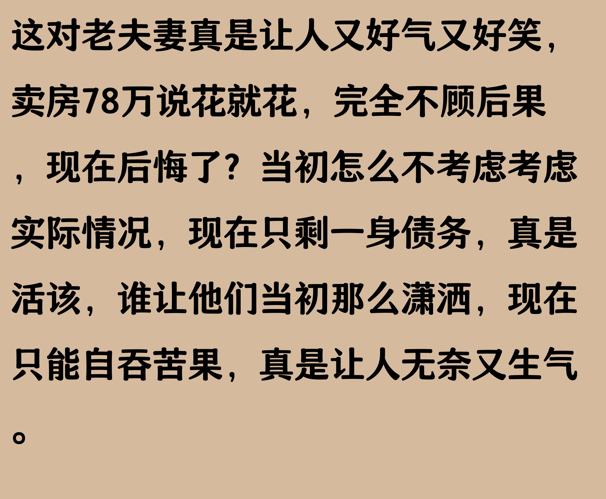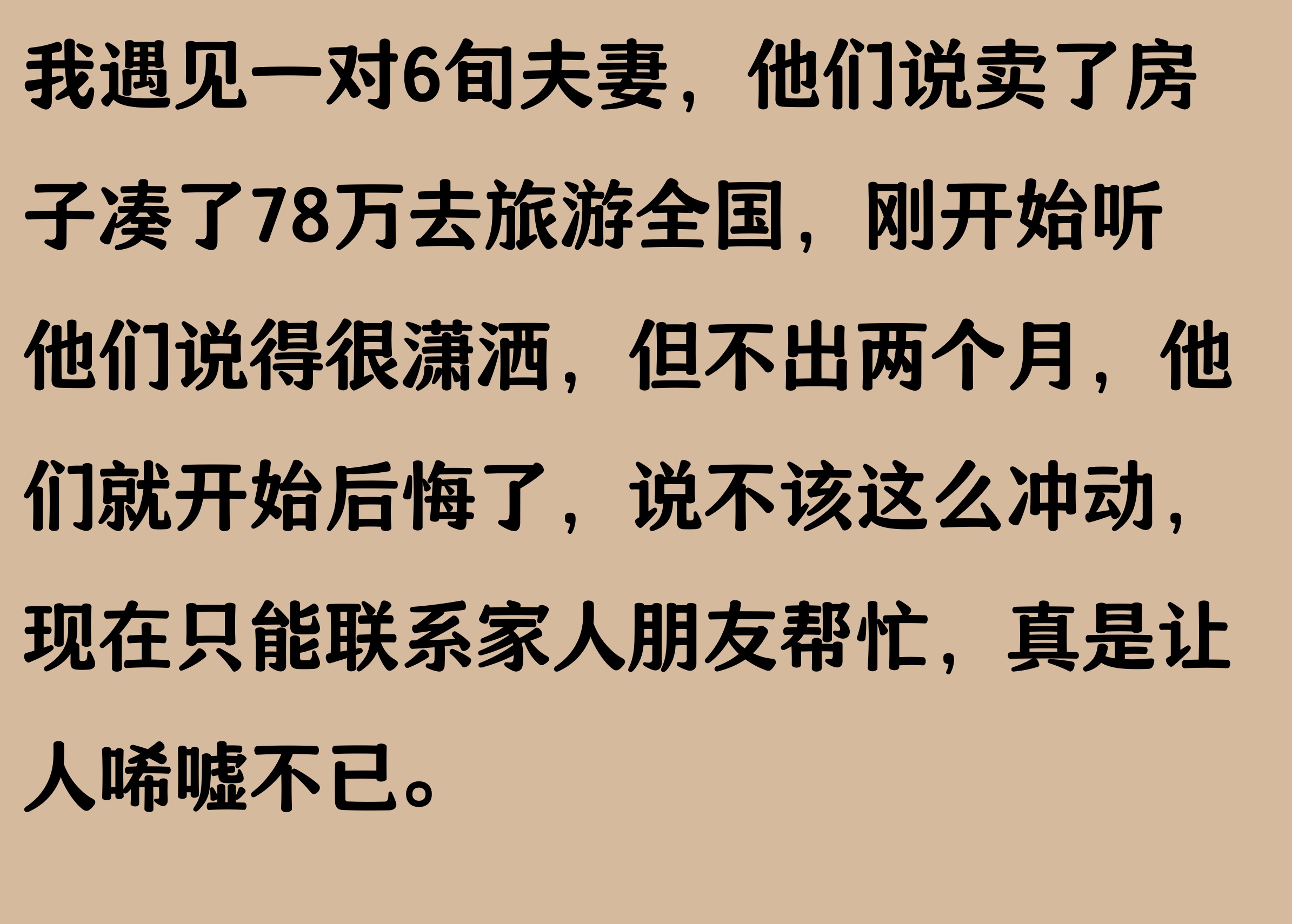 有一次在公园散步,看到一对6旬的夫妻,他们手拉着手,看起来非常恩爱。我原以为他们是一对幸福的夫妻,结果听到他们提到卖房凑了78万去旅游全国的事情。一开始他们很潇洒,但不出两个月,他们就后悔不已了。我还是第一次见到这种为了追求一时的潇洒,而忽略了家庭的后果。