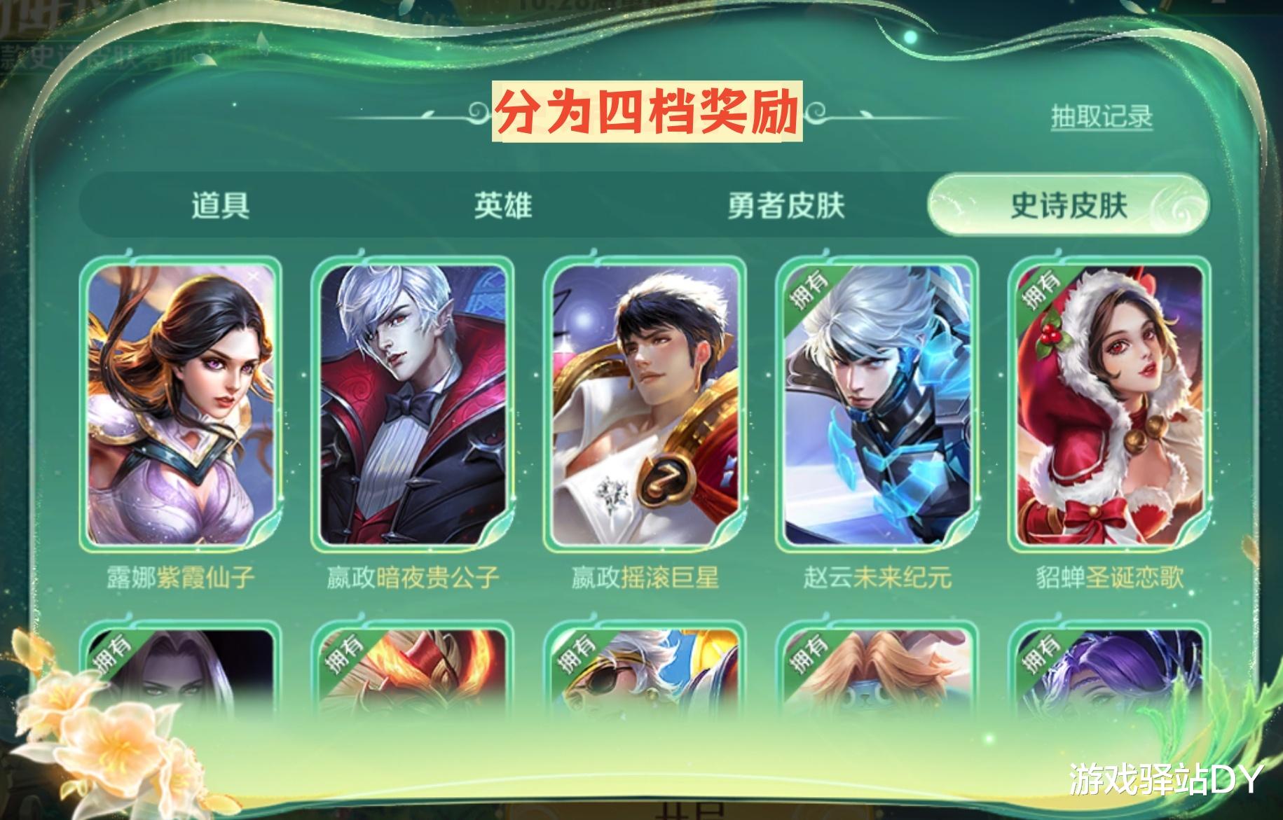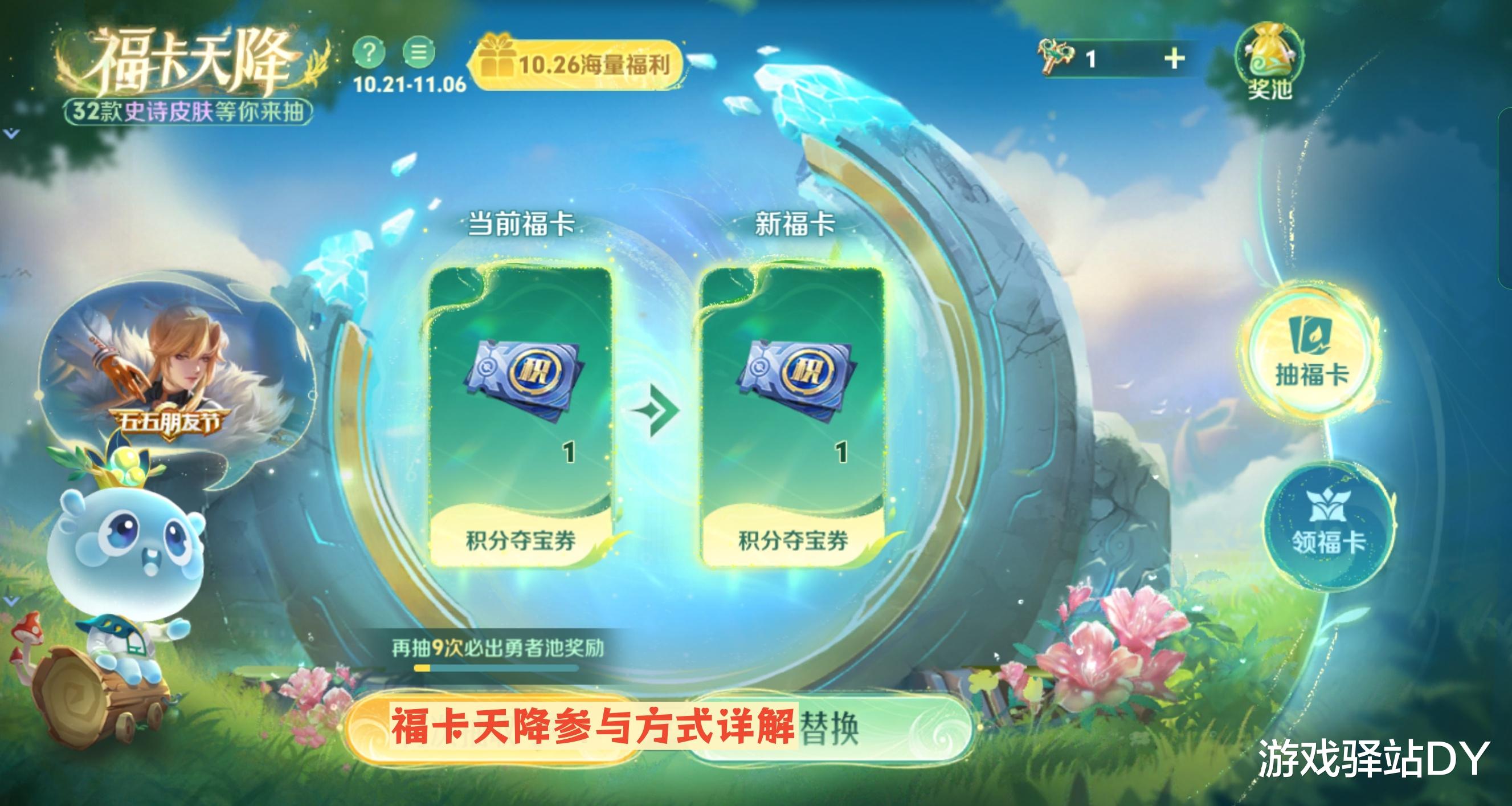 每次消耗1个钥匙可抽取福卡,也就是刷新奖励,奖励区分为四档,分别是道具、英雄、勇者皮肤、史诗皮肤,包含了盾山、沈梦溪等9位英雄;李白敏锐之力、猪八戒年年有余、阿离花间舞等48款勇者/伴生皮肤;以及夏侯惇乘风破浪、露娜紫霞仙子、貂蝉圣诞恋歌等32款史诗皮肤。其中第10/30/50/70次能够必出勇者皮肤或积分夺宝券,而第20/40/60/80次能够必出史诗皮肤,除此之外,10月26日首次抽取也能必出史诗,等于是史诗奖励最少能刷到5次。