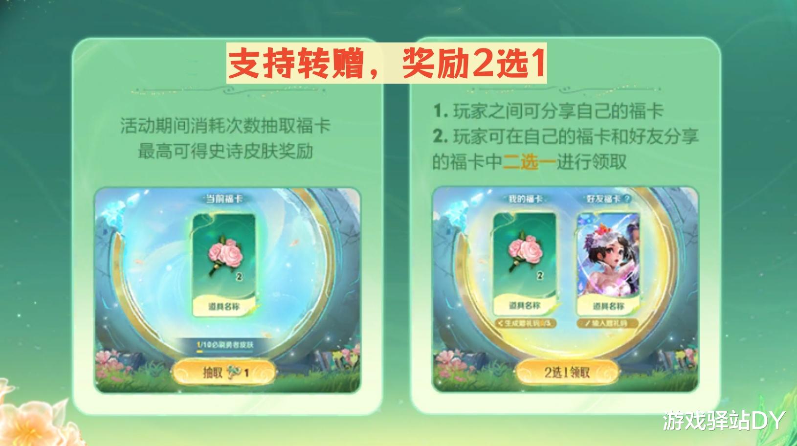 与回忆礼册系统不同的是,“福卡天降”除了自己刷新奖励外,也可领取好友赠送的福卡,但需要注意的是整个活动期间只能领取1次奖励,也就是自己和好友的福卡2选1,该机制的好处是省去玩家自己刷新的过程,反之也可将好友需要的福卡赠送给对方。