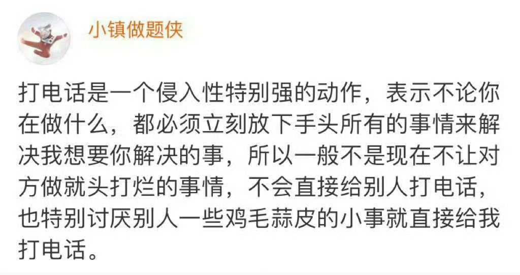 为什么有人说打电话是一个入侵性特别强的动作?以前不理解,现在明白了[摊手]以前打电话聊的是家长里短,是八卦消遣,那个时候打电话是一个很好的维系感情的工具[给你小心心]而现在上班后的每一通电话都意味着有事去找你,无论鸡毛蒜皮的小事还是着急慌忙的大事,但休息时间给你打电话都是让你加班的[跪了]表示无论你现在在做什么都必须放下后头上的所有事情,来解决我想要你解决的事情感觉就像24小时随时待命的马楼[淡淡的][淡淡的][淡淡的]