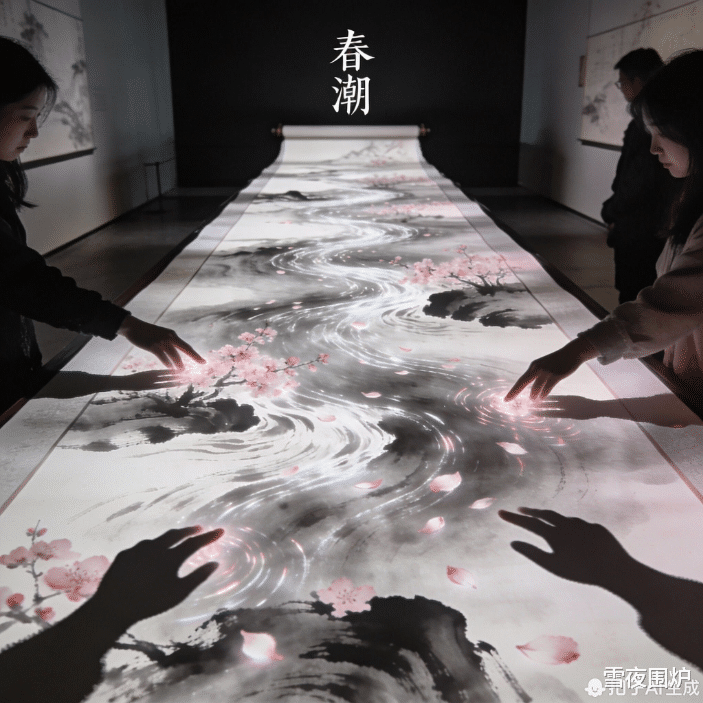 AI艺术再造古典美学数字艺术展《春潮》系列:通过华为平板拟真笔触还原水墨韵味,将“春江水暖鸭先知”的意境转化为交互式数字长卷。三星堆主题《轮回之韵》:基于昇腾AI生成青铜纹样动态粒子,重构“蚕丛及鱼凫,开国何茫然”的蜀文化史诗。
