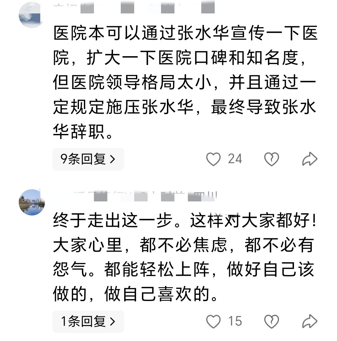 这个消息一出来,很多网友对于张水华就感到非常同情了,觉得医院领导没有格局,没有温度,是他们逼迫了张水华辞职。