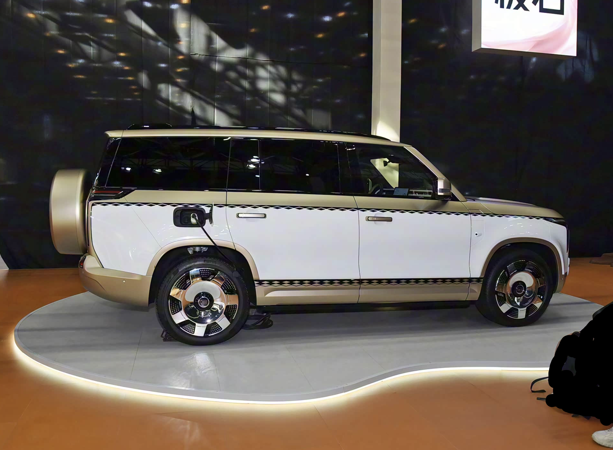 颜值方面,极石01整个车头造型十分方正,蚌壳式的前舱盖严丝合缝的卡主车头,矩形的格栅搭配着斜巷交错的黑色镂空中网,两侧配备了古代兵器“戈”样式的大灯,黑色的外边框内部融入了全LED光源,很有中国古典特色,同时也不缺乏科技感。大灯下方蜂窝饰条升级为封闭式设计,黑色的粗犷保险杠也十分气派。车尾配备了全尺寸外挂式备胎(俗称“大书包”),侧开式的尾门也提升了整车的实用性。两侧冷兵器戈样式的尾灯内部融入了间断式的红色光带,辨识度很高。黑色的后保险杠呼应了车头,也更加粗犷。
