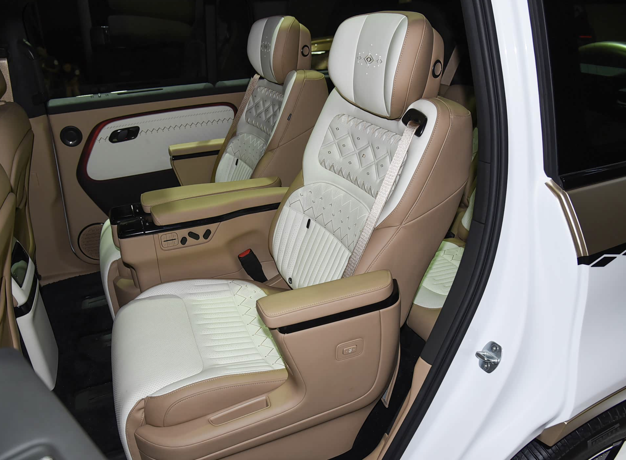 极石01座舱经过了重新设计,车内采用了大面积白色软性材质和浅棕色Nappa真皮材质的铺陈,再加上亮黑色的钢琴烤漆边框和银色的金属元素,低饱和度且很有质感的面料也营造出“老钱风”式的氛围感。中控台配备了双辐式多功能方向盘,黑色真皮材质的包裹,12点方向还带有回正皮标。操控岛区域配备了传统的换挡手柄,前方是手机无线充电模块,右侧是两个标准的杯架。第一排配备了略带运动属性的真皮沙发座椅;第二排配备了零重力座椅;第三排配备了舒适的沙发座椅。科技感方面,该车配备了15.7英寸中控屏、12.3英寸液晶仪表、AR-HUD抬头显示以及后排娱乐屏,车载冰箱、香氛系统,科技感十足。