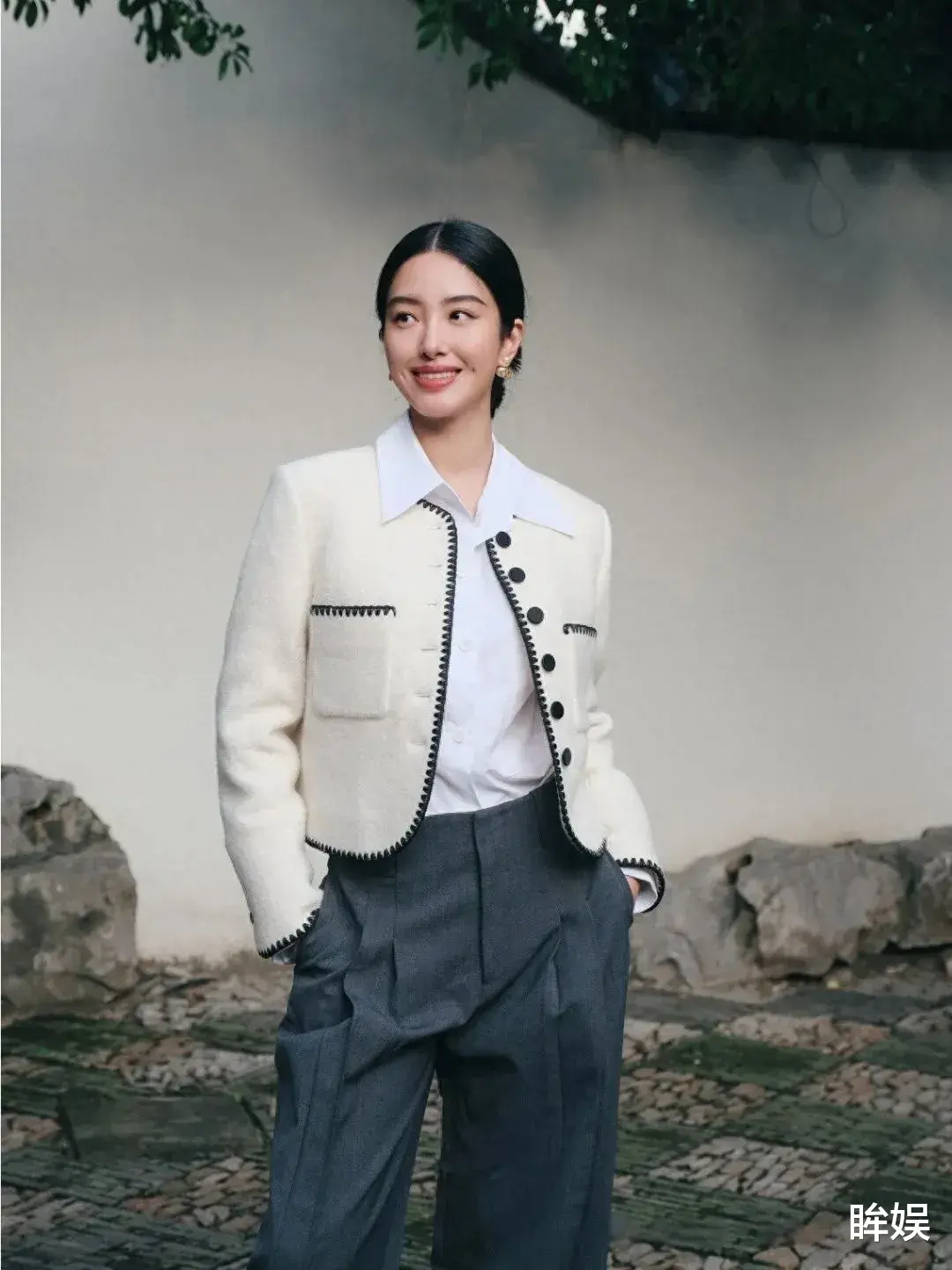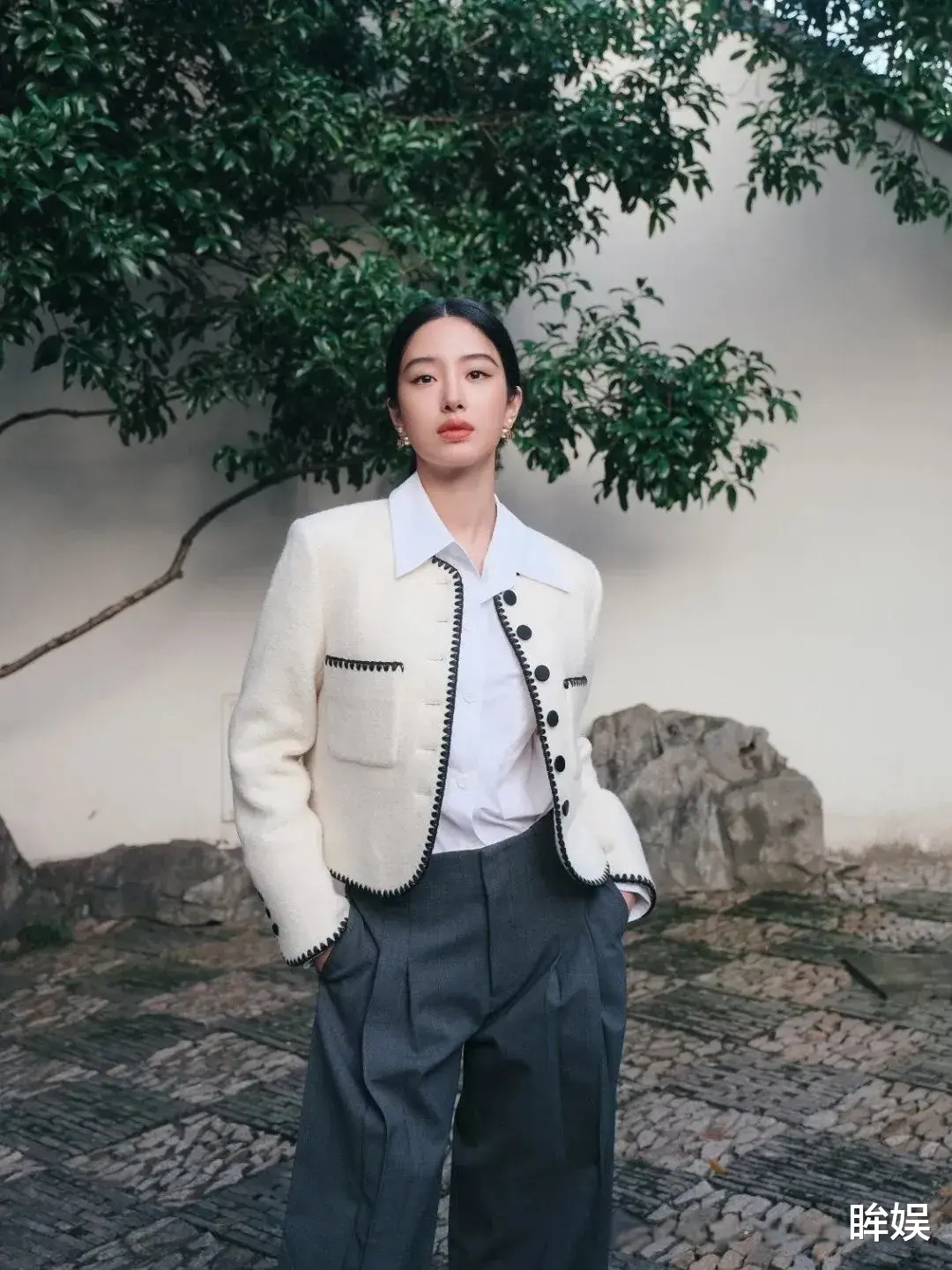 这件小香风外套面料看着很复古,版型自带一种干脆利落的视觉效果,穿上去看着很精致贵气。她还内搭了一件白色衬衫,为整体造型增加了一种干练的气质。