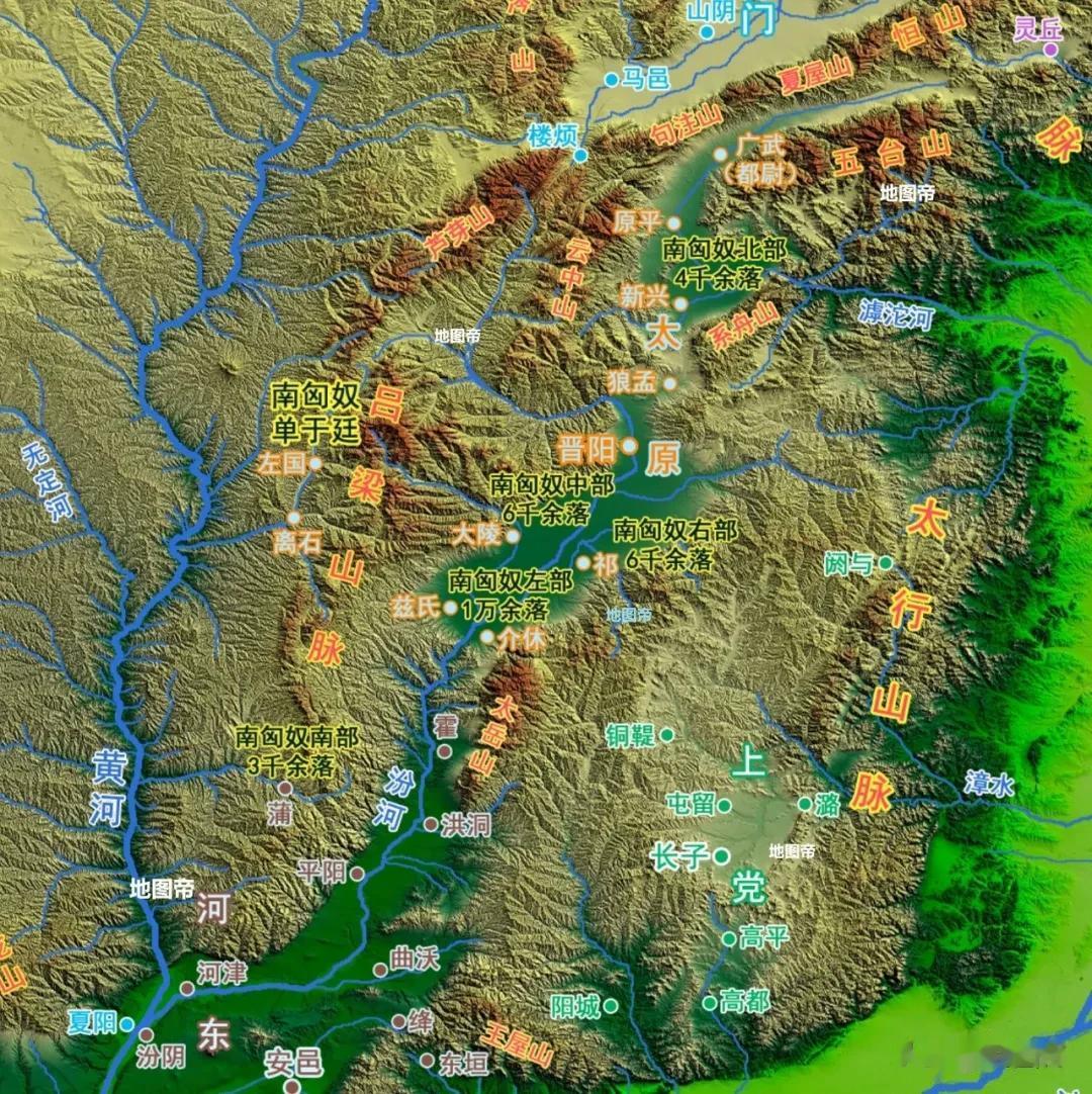 南匈奴左部都尉,领一万余落,居于太原郡兹氏县(今山西汾阳市);中部都尉领六千余落,居于太原郡大陵县(今山西吕梁文水县);右部都尉领六千余落,居于太原郡祁县(今山西晋中祁县);北部都尉领四千余落,居于太原郡新兴县(今山西忻州);南部都尉领三千余落,居于平阳郡蒲子县(今山西临汾隰县)。