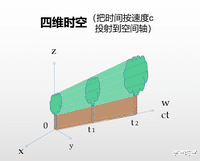 在四维时空里,空间的三个维度(x、y、z)和时间维度(t)不再是孤立的,而是被统一成一个整体。为了让时间维度与空间维度在数学上具有可比性,闵可夫斯基引入了 “光时” 的概念,将时间 t 乘以光速 c,得到 ct,这样时间维度就具有了长度的单位(米)。因此,四维时空的坐标可以表示为(x, y, z, ct)。