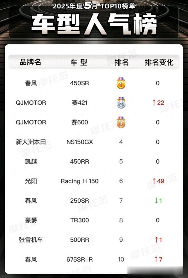 一转眼25年都快过了一半,时间已来到六月份,而刚过去的五月份国内摩托车排行榜最刚新出炉。此排行榜是根据国内摩托车网络平台上各车型的查阅量与口碑评分高低而总结出,一定程度上能看出有哪些车型的热度和评分反馈比较高,可提供准备买车的作参考。