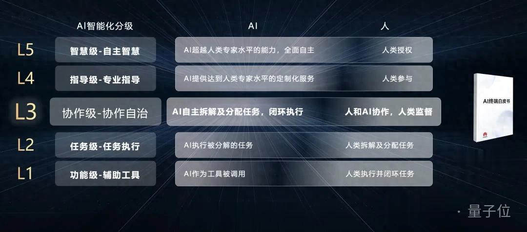 演讲中,贾永利重点提到了终端智能化L1~L5分级标准——来自华为与清华大学人工智能产业院(AIR)联合编写的《AI终端白皮书》。
