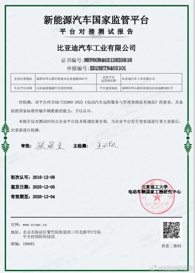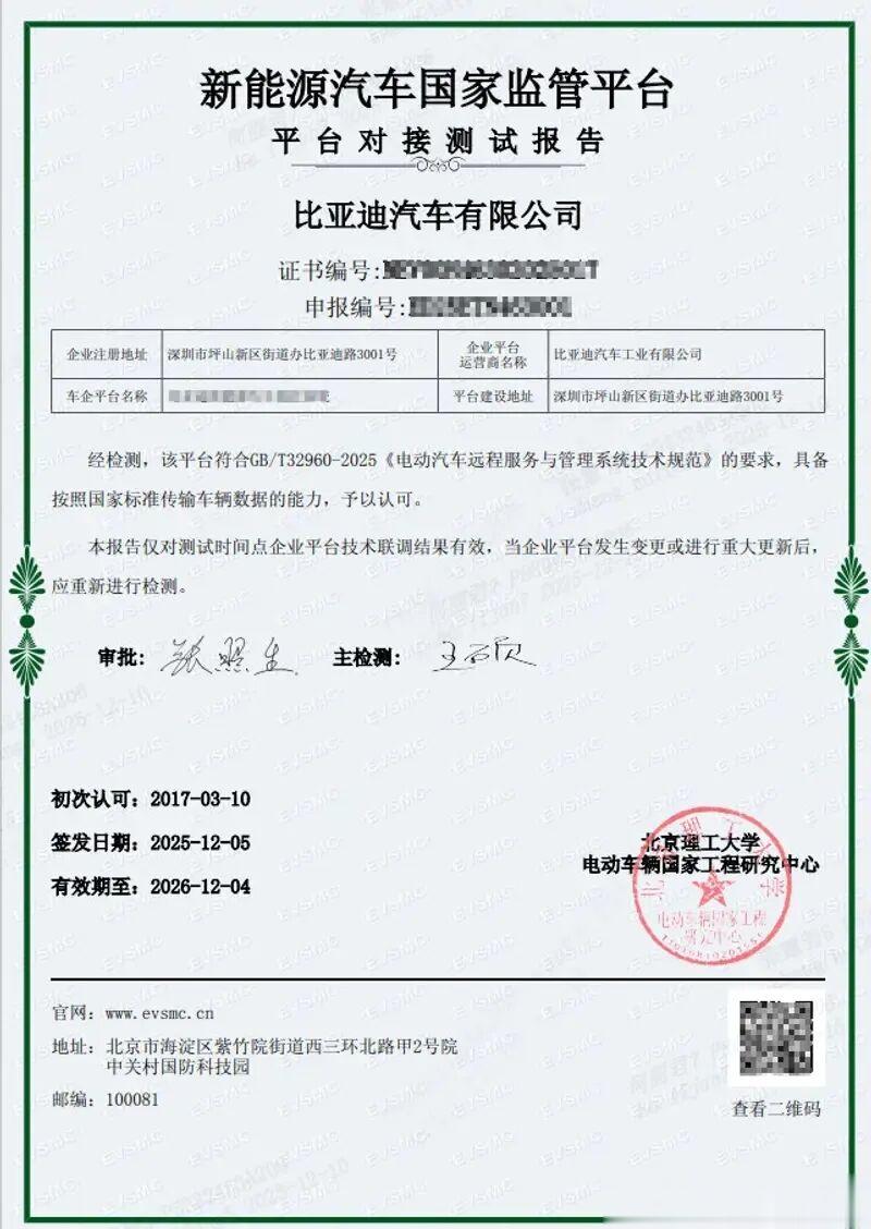 汽车事件三:比亚迪成为国内首批获新能源国家监管平台符合性认证车企之一