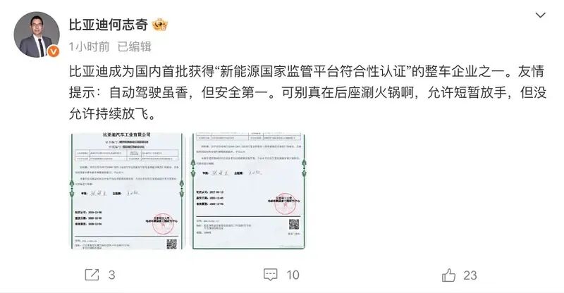 12月17日,比亚迪股份有限公司执行副总裁何志奇在社交媒体上宣布,比亚迪成为国内首批获得“新能源国家监管平台符合性认证”的整车企业之一。不过何志奇特别强调,自动驾驶虽香,但安全第一。可别真在后座涮火锅啊,允许短暂放手,但没允许持续放飞。