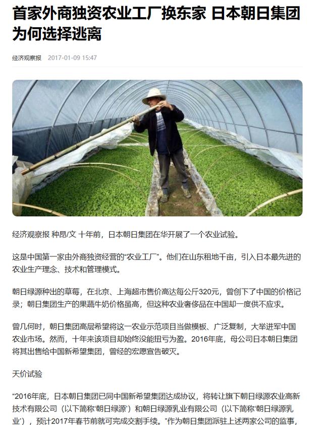 随着几个公司撤资后,朝日绿源1500亩的农场卖给了中国的乳制品公司。