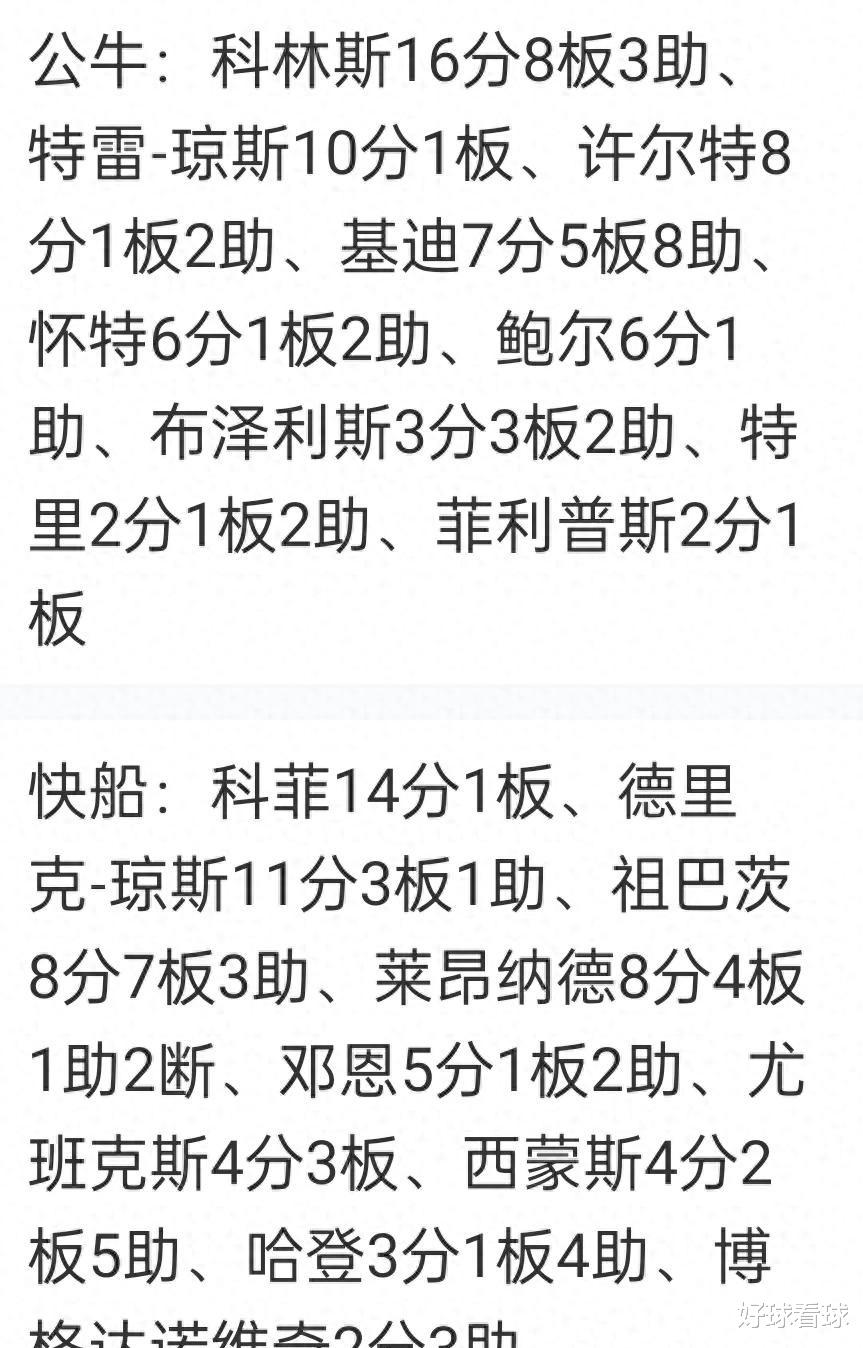 公牛方面,波格丹诺维奇贡献14分6助攻,在进攻端展现了不俗的能力,但未能阻止球队最终的失利。