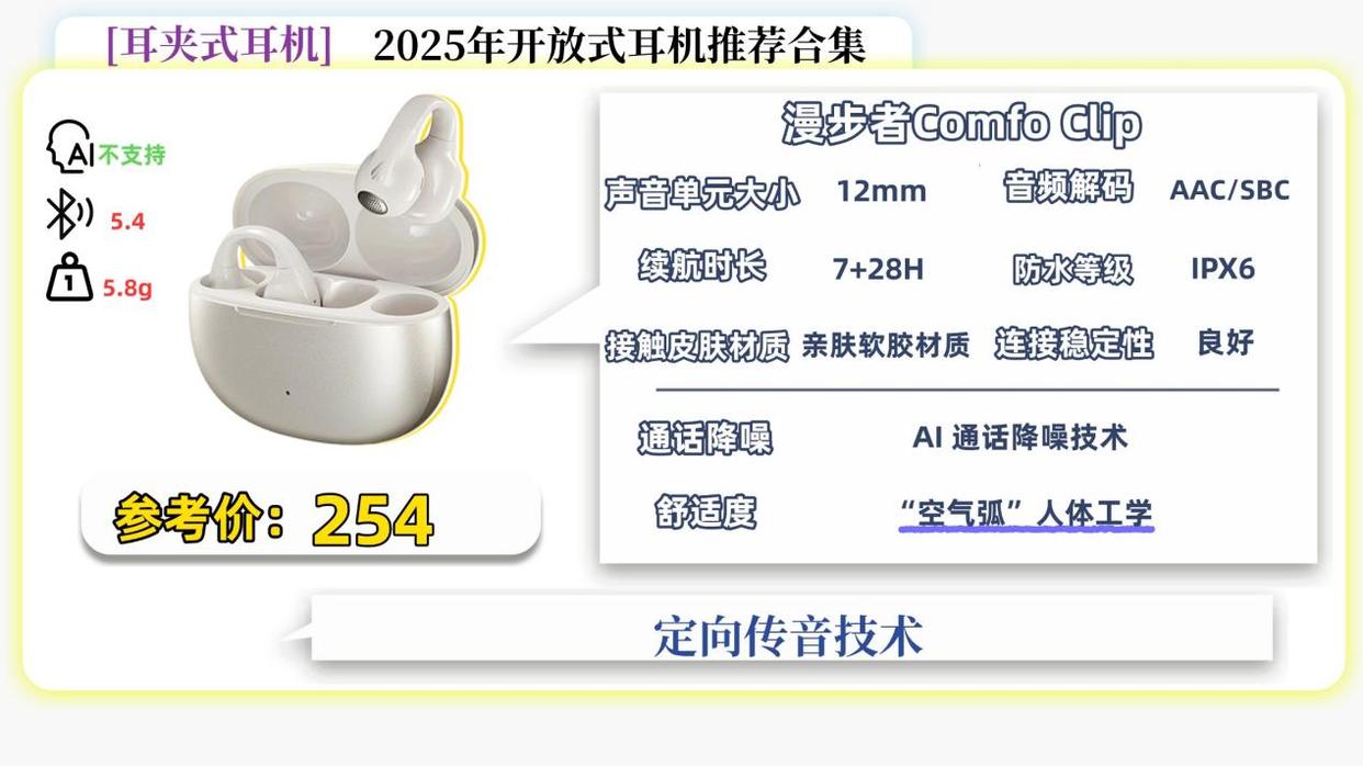 2.漫步者Comfo Clip参考价格:254元综合性能评分:79分推荐理由:续航时间够长,可以满足日常需要
