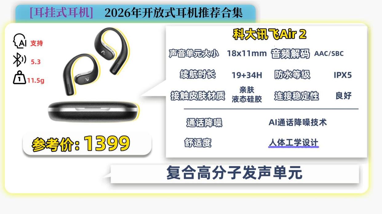 8.科大讯飞Air 2参考价格:1399元综合性能评分:90分推荐理由:音质表现可以满足日常的听歌和追剧需求