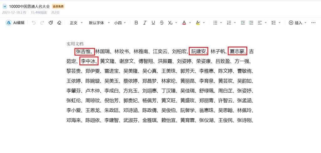 这件事说起来挺让人意外的,2025年2月湖北竹溪县住建局发布了一份中标公告,评审组里列出五个名字:张吉惟、林坡书、阮建安、李中冰、夏志豪,到了12月,又有一个3188万元的设备租赁项目公布,这次评审名单换了几个人,但张吉惟依然在里面,有人顺手查了一下,发现这八个名字全部出现在百度文库一个叫《10000中国普通人名大全》的文档最前面部分,两个项目加起来涉及六千多万元资金,结果评审名单竟然是从公开文档里直接抄来的。
