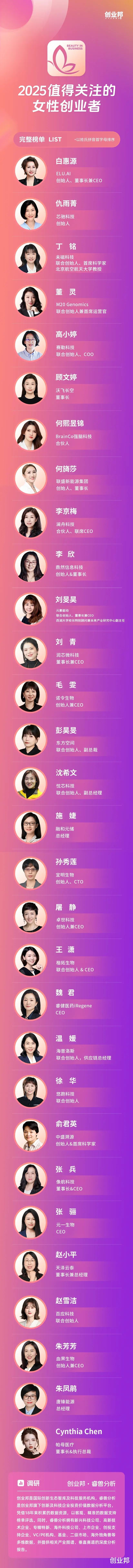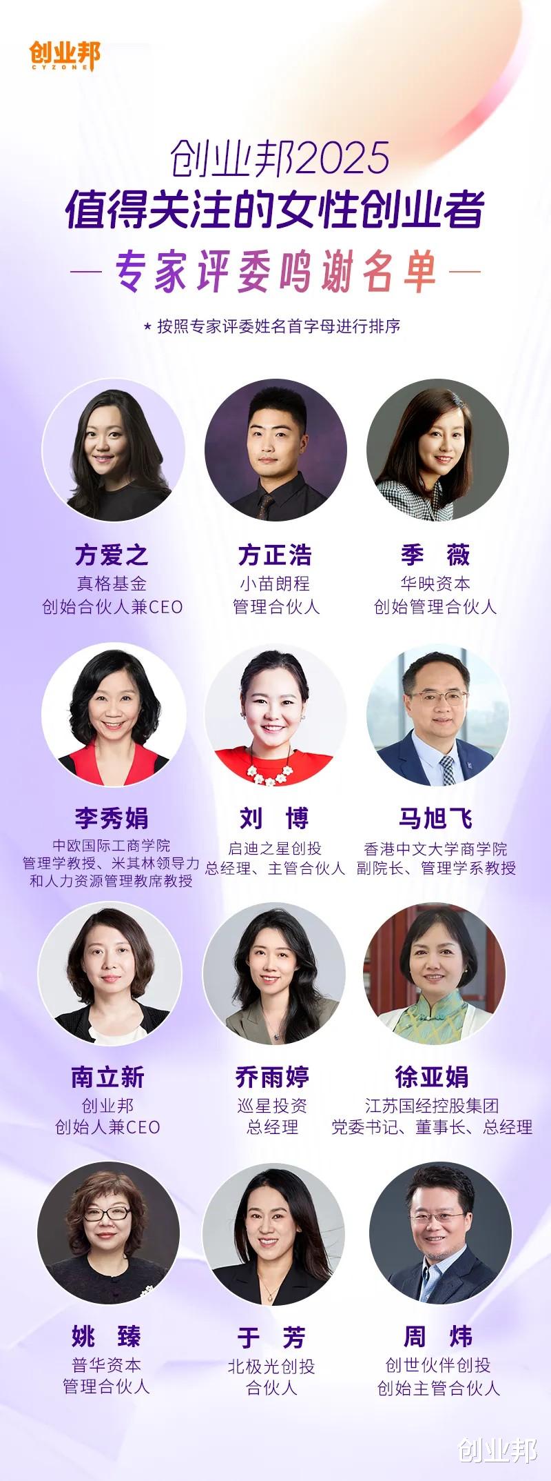 时至今日,2025年的女性创业者评选活动已经结束,我们继续聚焦杰出的新生女性商业领袖,讲述她们的故事,传递她们的精神。今年的女性创业者评选,我们延续“专家评委打分”的方式,结合候选人成长经历、企业发展潜力及资本价值等评审维度的综合表现对候选人进行评分,最终评出2025值得关注的女性创业者榜单。