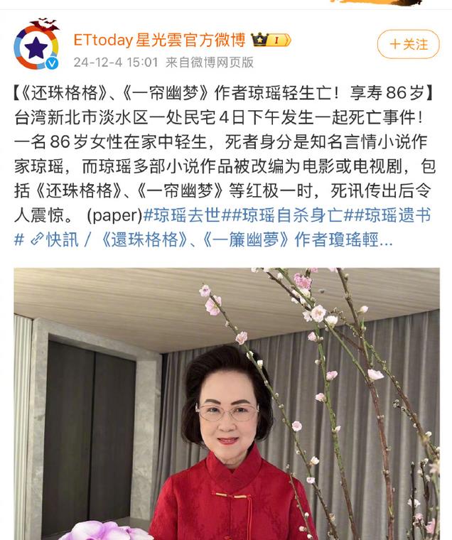 信息来源:看看新闻——琼瑶遗体预计周五火化 下周一按其遗愿花葬,2024年12月5日